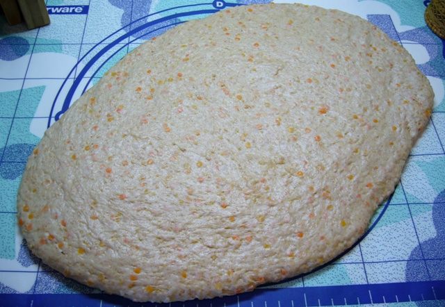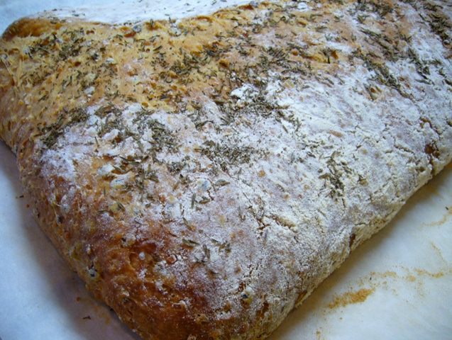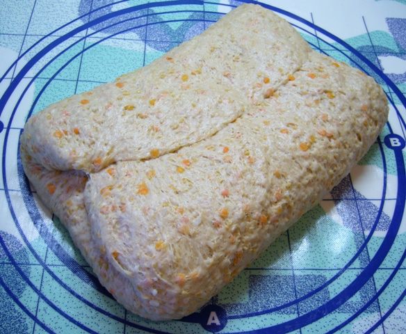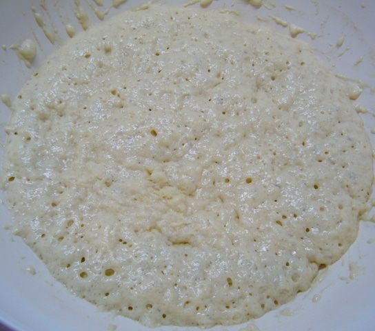Теперь лучше положить тесто на противень, накрытый бумагой для выпечки. Посыпать мукой, накрыть полотенцем, оставить в теплом месте на 2 ч. Я оставила тесто на столе, оно так поднялось! Просто невесомое было! Когда стала перекладывать его на противень, оно осело. Так что хлебушку лучше подходить прямо на противне!