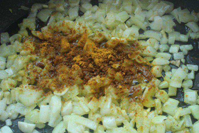 Добавить карри и сухой перец чили. Семечки из перца можно удалить, но я этого не сделала. Захотелось настоящего острого карри)))