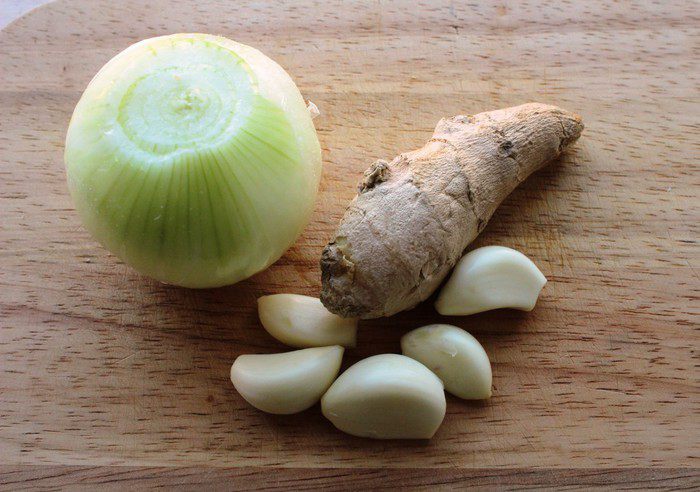 Лук, чеснок и корень имбиря очистить. Нам понадобится 2-2,5 см корня.