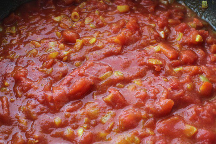 Добавить измельченные томаты вместе с соком, довести до кипения, приправить солью.