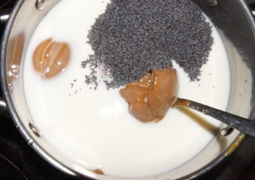 В кастрюле нагреть молоко, добавить мак, соль, вареную сгущенку. Перемешать венчиком до растворения.