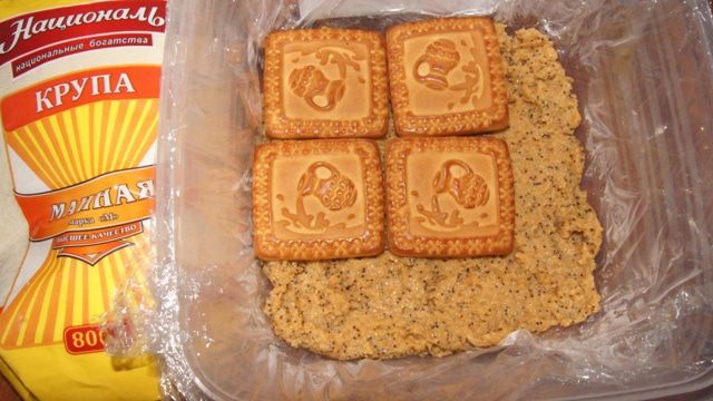 Форму или контейнер выстелить пищевой пленкой. Выкладывать десерт слоями, чередуя манную кашу с печеньем. Убрать в холодильник на 3-4 часа.