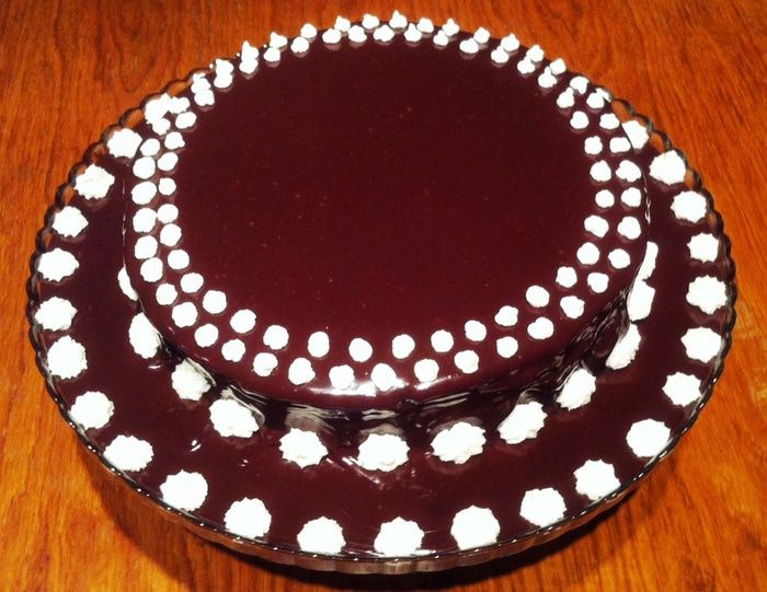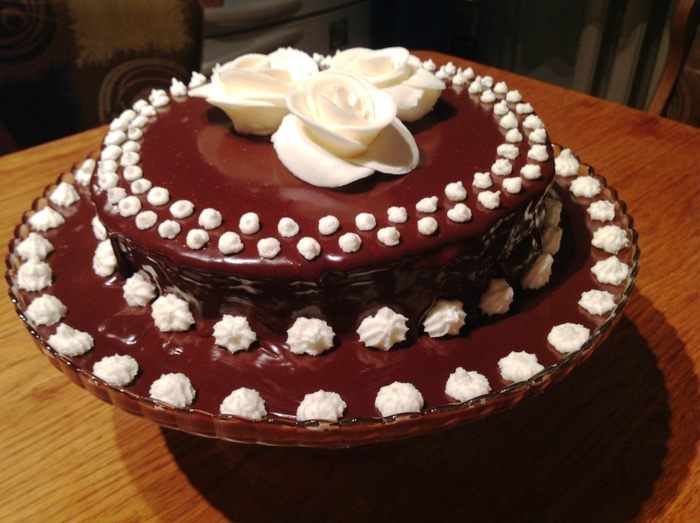 Верхний корж не промазывать, но я промазала, т.к. я собирала торт на следующий день, то решила подстраховаться, чтобы и верхний корж пропитался. Затем, когда я украшала торт, я просто сняла верхний слой крема.