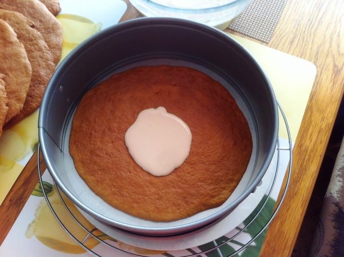 Утром я собирала смазанные коржи кремом в форме друг на друга, слегка прижимая.