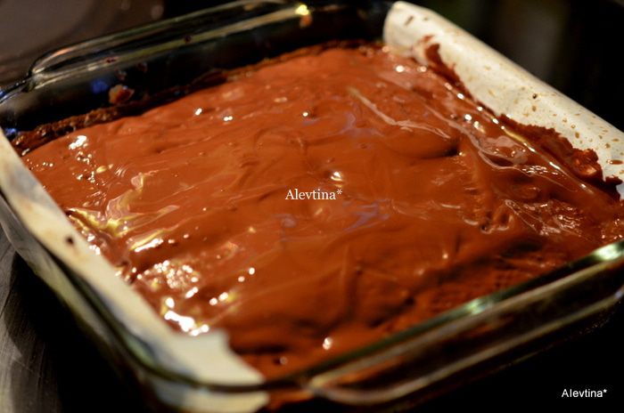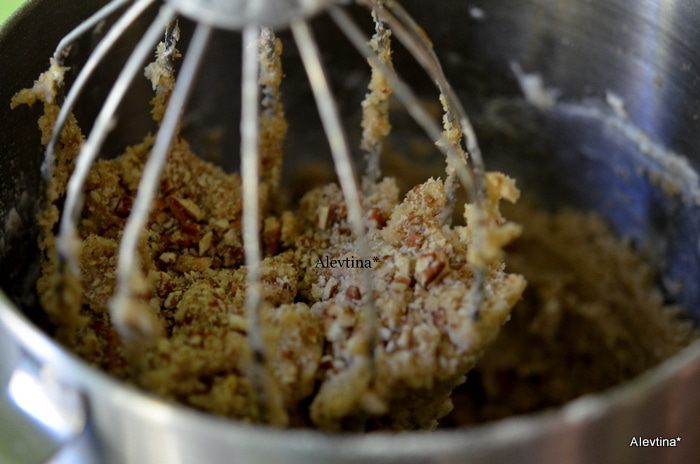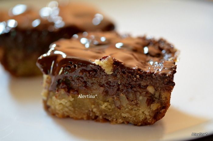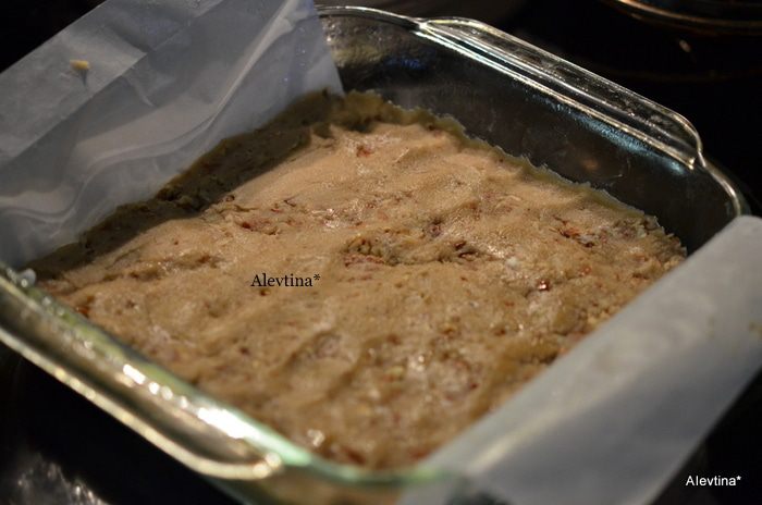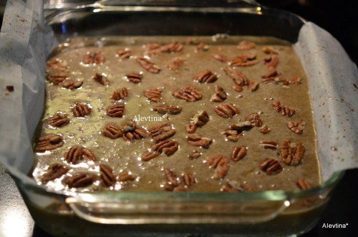 В чистой емкости смешать 2/3 стакана кукурузного сиропа, 1/2 стакана коричневого сахара, 2 яйца, 2 стол.л растопленного маслоа, 1 ч.л ванилина и 1/4 ч.л соли. Вылить поверх бисквита. Затем выложить рубленый пекан 1 1/2 стакана, я сократила кол-во для себя. Поставить в духовку на 35 мин.