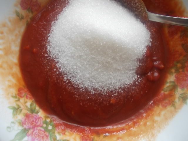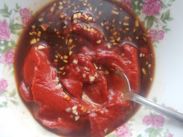 Измельчить чеснок,добавить к соевому соусу,томатной пасте и уксусу.
