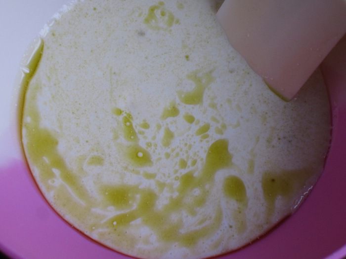 Белок взбить с сахаром, добавить творог, молоко, масло. Хорошо перемешать.
