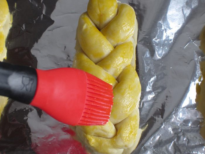 Яичный желток слегка взбить вилкой. Выложить булочки на противень с пергаментом или фольгой, смазать яичным желтком.