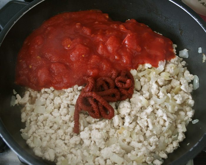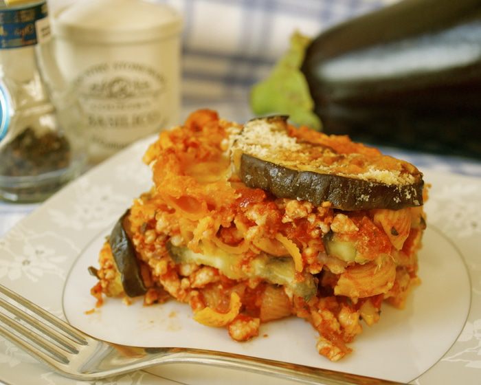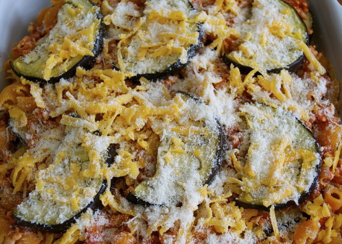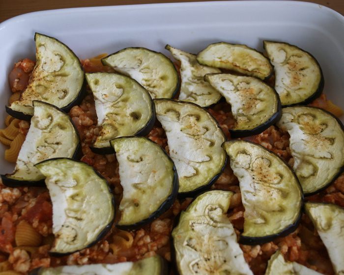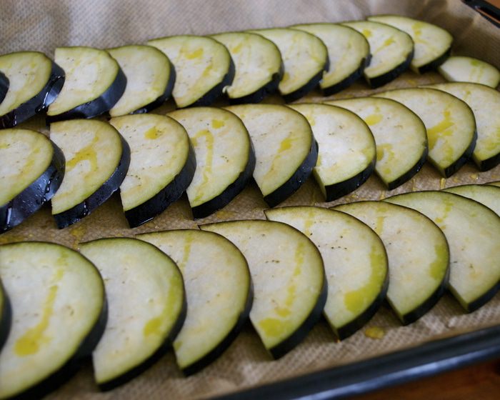 Баклажан нарезать тонкими ломтиками. При желании посолить и оставить на 30 минут, чтобы стек горький сок (я этого не делаю!). Тем временем нагреть духовку до 180 С. Смазать большой противень оливковым маслом, затем слегка смазать дольки баклажанов (2 ст.л.) маслом и уложить их, с некоторым нахлестом на противень. Запекать в духовке в течение 7-10 минут.