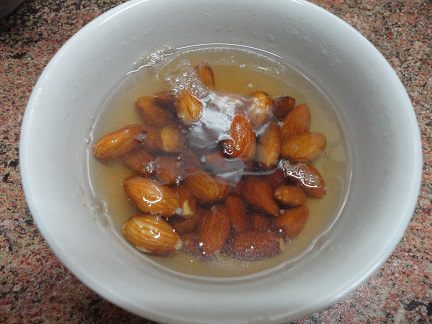 Миндаль (если это необходимо) для очистки от кожицы залить кипятком и оставить на 10 минут.