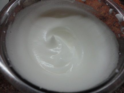 Оставшийся сахар взбиваем с белками до устойчивых пиков и частями, осторожно вводим в основную массу. Теперь тесто стало жидким.