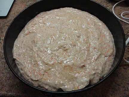 Желтки отделить от белков и взбить с половиной сахара до пышной белой пены, добавить просеянную муку с рзрыхлителем и корицей, перемешать, добавить алкоголь. Затем морковь с цедрой и орехи. Получается довольно плотная масса.