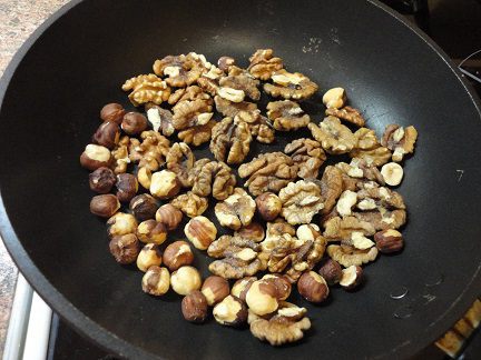 Фундук и грецкие орехи слегка поджарить в духовке или на сухой сковороде, чтобы отшелушить кожицу.