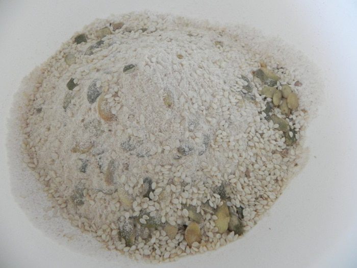 Духовку разогреть до 200С. Дрожжи и мед растворите в 1 ст.л. теплой воды. В миске смешайте все сухие ингредиенты.