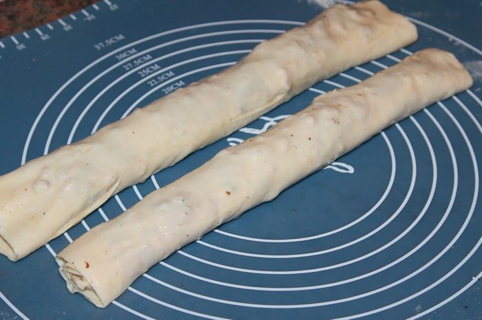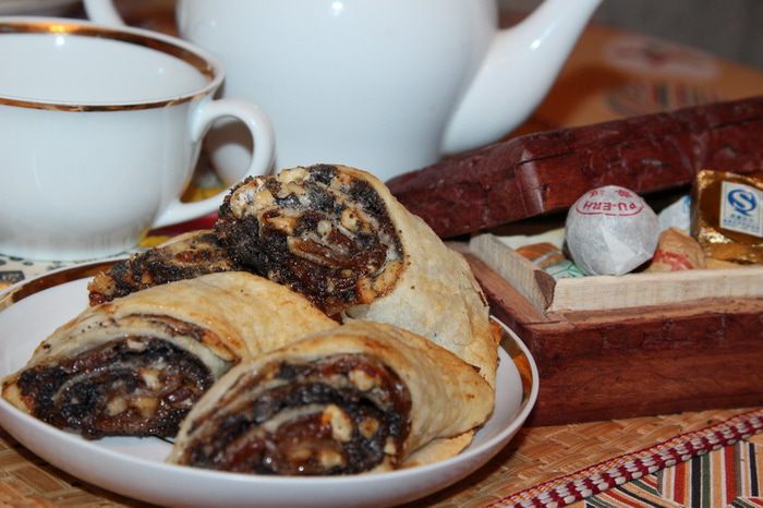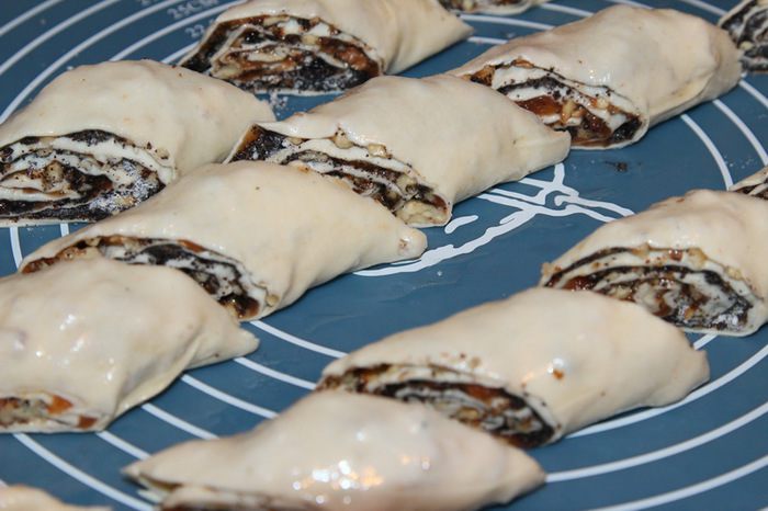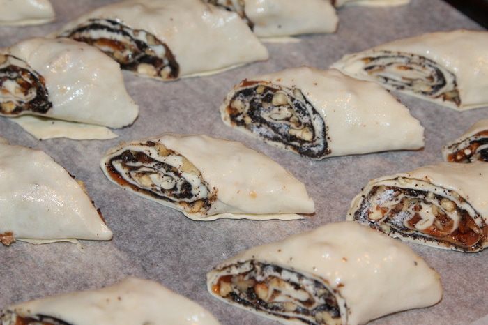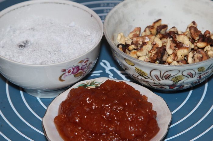 Из муки, соли, растительного масла и воды замешиваем тесто, выкладываем на поверхность для вымешивания и месим руками, добавляя муку, до тех пор, пока тесто не перестанет липнуть к рукам. Тесто не должно быть крутым, иначе Вы его не вытяните. Оно должно быть достаточно мягким. Слепили колобок , помещаем в емкость, затягиваем пленкой и отправляем в холодильник на пол-часа. Процесс можно посмотреть в моем рецепте http://www.edimdoma.ru/retsepty/63866-shtrudel-iz-vytyazhnogo-testa-s-vishnyami. Пока тесто отдыхает в холодильнике, готовим начинку: мак вместе с сахарной пудрой смолола в кофемолке, орехи подсушила на сковороде, подготовила яблочное повидло.