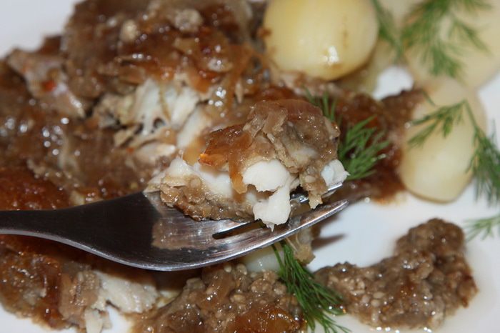 Собираем наше блюдо: в емкость для запекания выкладываем в один слой рыбу, затем половину лука и 1/3 часть баклажанового пюре. Затем снова слой филе и баклажанового пюре. Верхний слой: филе рыбы, баклажановое пюре и карамелизированный лук.