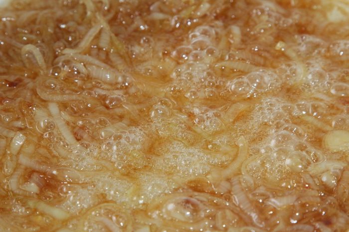 Пока маринуется рыба, карамелизируем лук: нарезаем полукольцами и отправляем на разогретую сковороду с растительным маслом. Готовим до прозрачности, затем добавляем столовую ложку сахара и 2 столовые ложки соевого соуса. Готовим до получения легкой и светлой карамели (не больше минуты)