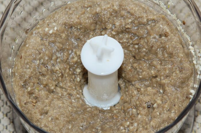 Баклажаны, 5 столовых ложек кунжута, 1 зубчик чеснока (мелко нарезанный) и 3 столовые ложки оливкового масла отправляем в чашу блендера.