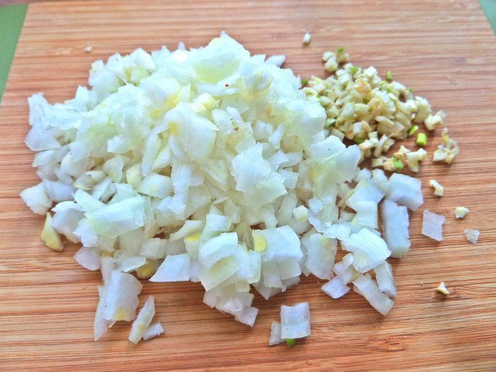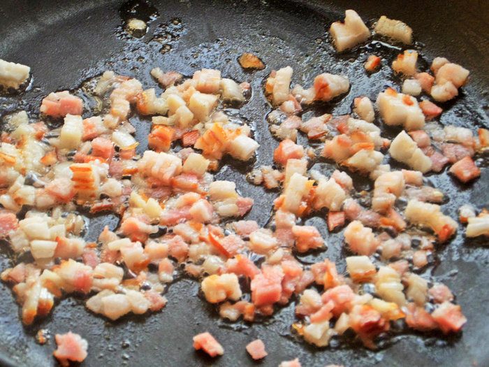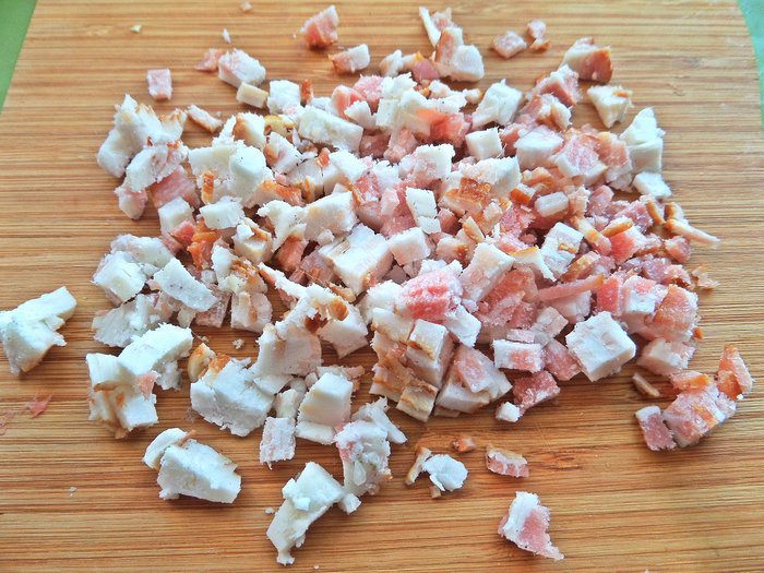 Бекон нарезать на кубики. У меня из морозилки, легко измельчить.
