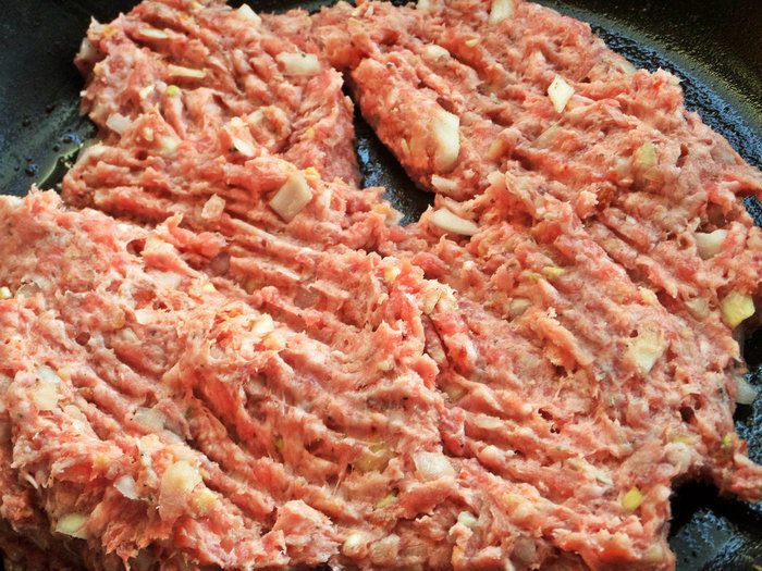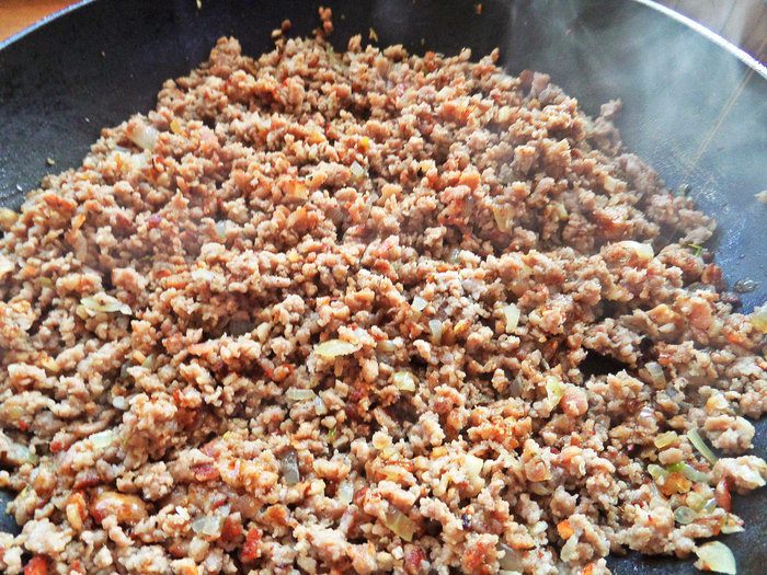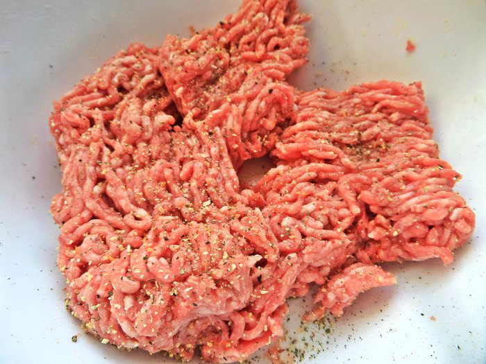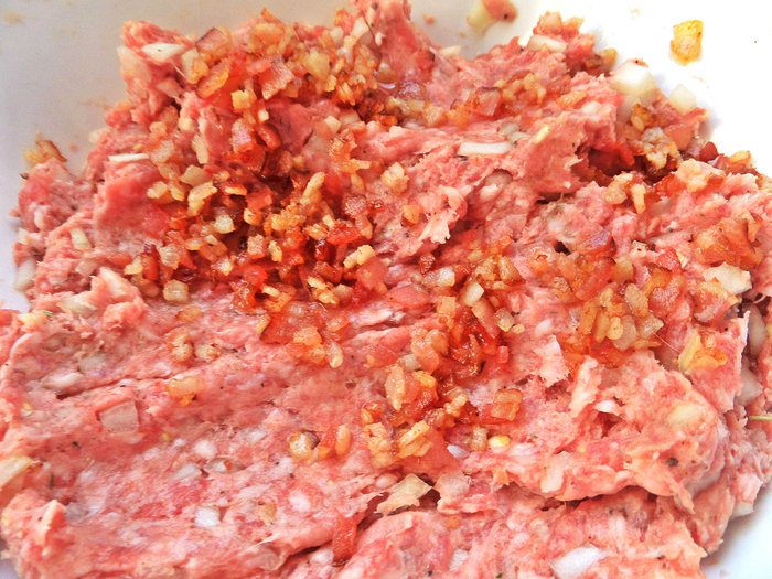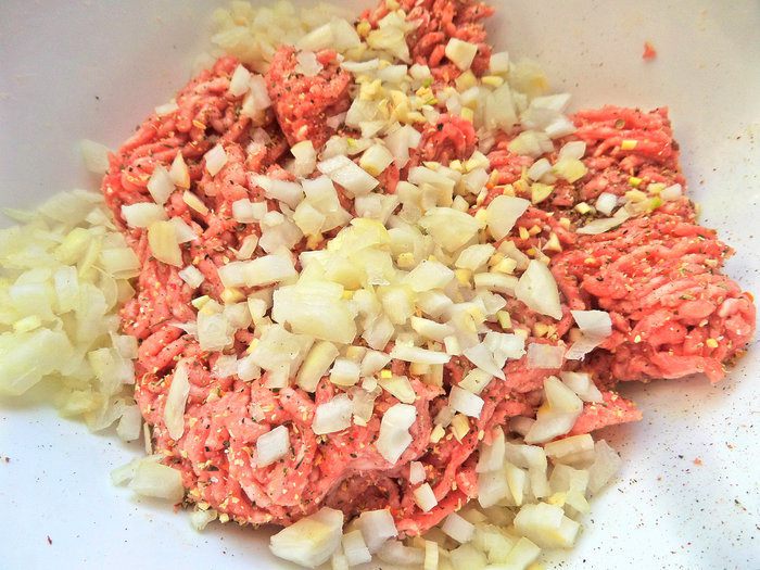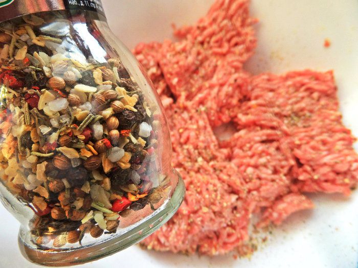 Для начинки взяла свиной фарш. Посыпала из меленки приправу «для мясных блюд».