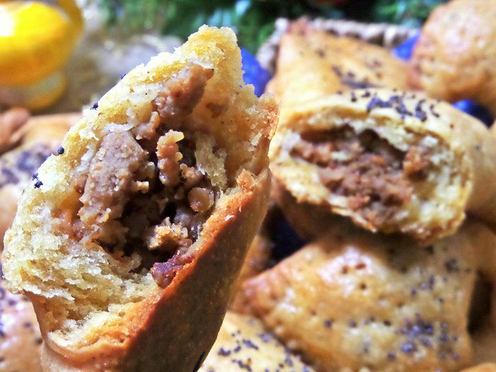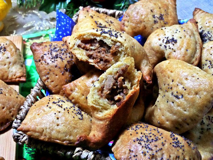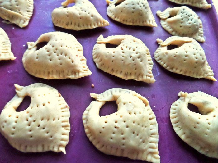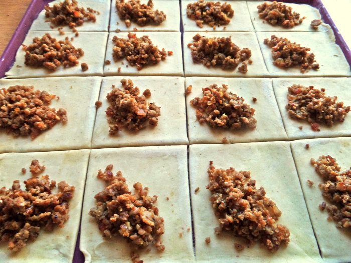 Зимой я пекла такие мини пирожки из своего любимого рубленного теста. Оно похоже и на слоеное и немного на песочное, быстрое и вкусное. Пекла с классической мясной начинкой, добавив бекон для аромата. Вместо фарша можно взять бекон и смешать с вареными яйцами или ветчина+яйца. Такое тесто подходит для любой начинки. Пекла и с рыбкой и с яблоками, типа слоек.