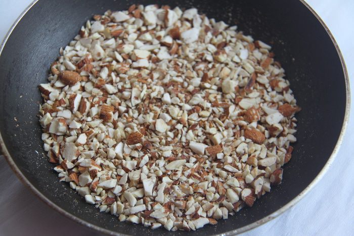Миндаль крупно порубить и слегка обжарить. Духовку разогреть до 180*С.