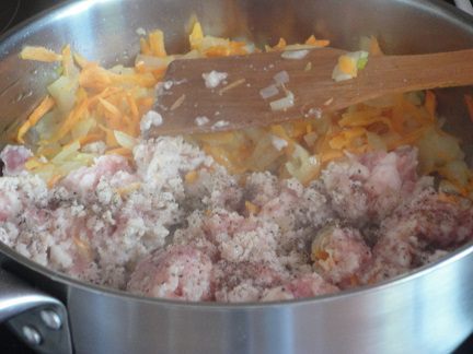 На сковороде разогреть растительное масло и слегка пожарить в нем лук (кубиками) до прозрачности. Добавить измельченную на терке морковь. Еще пожарить с минутку. Овощи сдвинуть на край сковороды и выложить свиной фарш, посолив и поперчив, добавив любимые специи. Перемешать его в начале самостоятельно, затем с овощами, добавить натертые на крупной терке кабачки, еще раз перемешать и закрыть крышкой. Оставить на медленном огне на 3-5 минут.