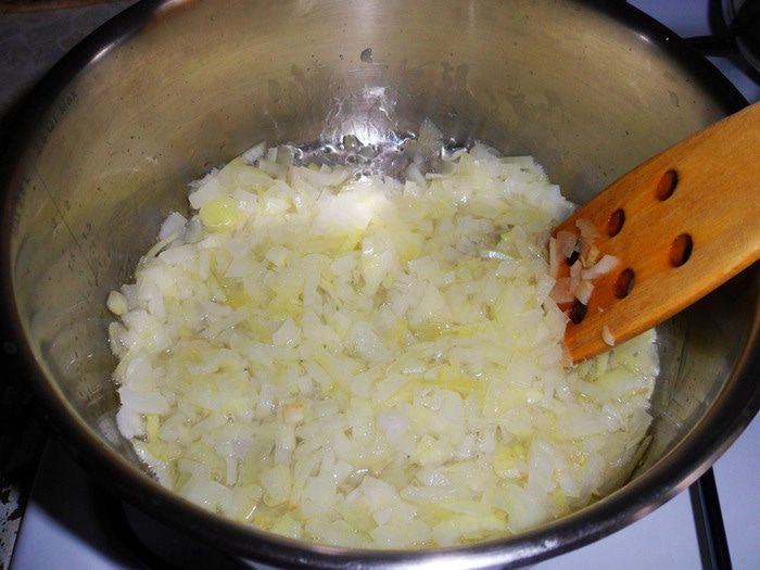 В кастрюле разогреть оливковое масло, обжарить до мягкости мелко нарезанный лук.