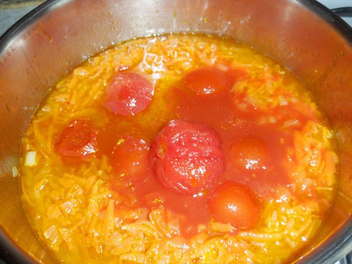 Добавить томаты консервированные очищенные вместе с соком в кастрюлю. Прогреть.