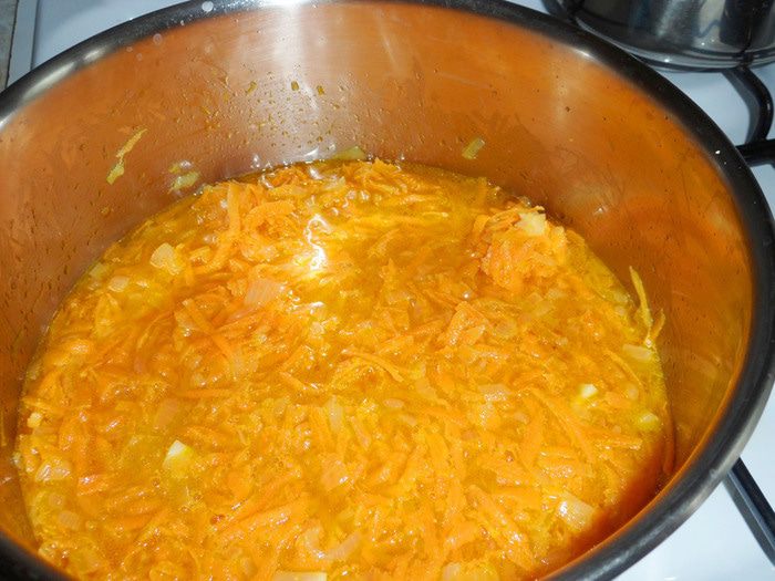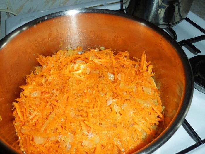 Добавить натертую на крупной терке морковь. Тушить до мягкости моркови.