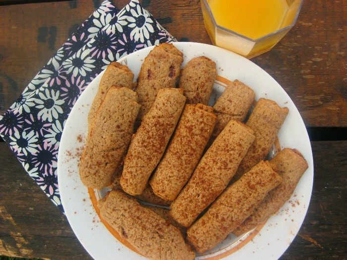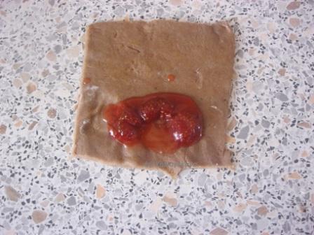 Разрезать на прямоугольники, выложить начинку, скрепив края.