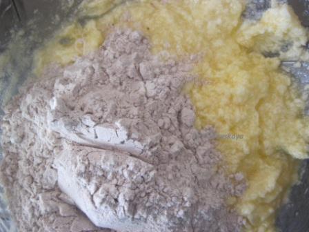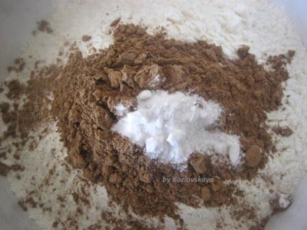 В отдельной миске просеять муку, добавить какао-порошок и соду, перемешать)