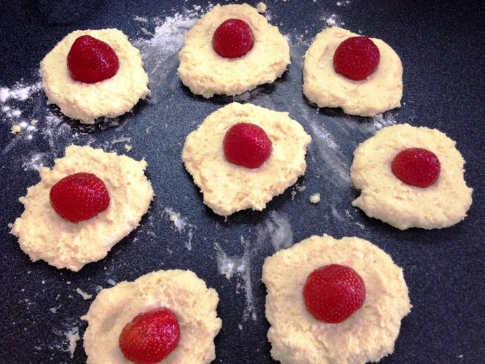 В серединку каждой добавляем клубничку и скатываем шарики.
