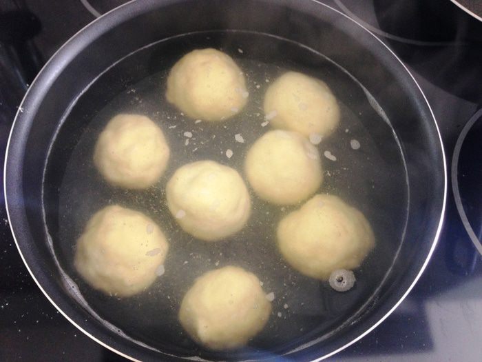 В кипящую воду отправляем наши шарики и варим, после того как всплывут, 3 мин.
