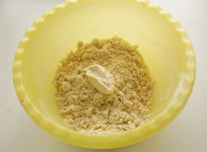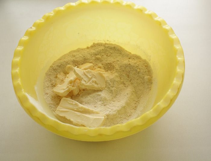 Добавить холодные кусочки масла и быстро перемешать все руками, разминая масло пальцами.