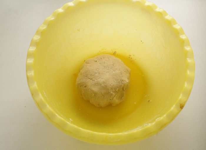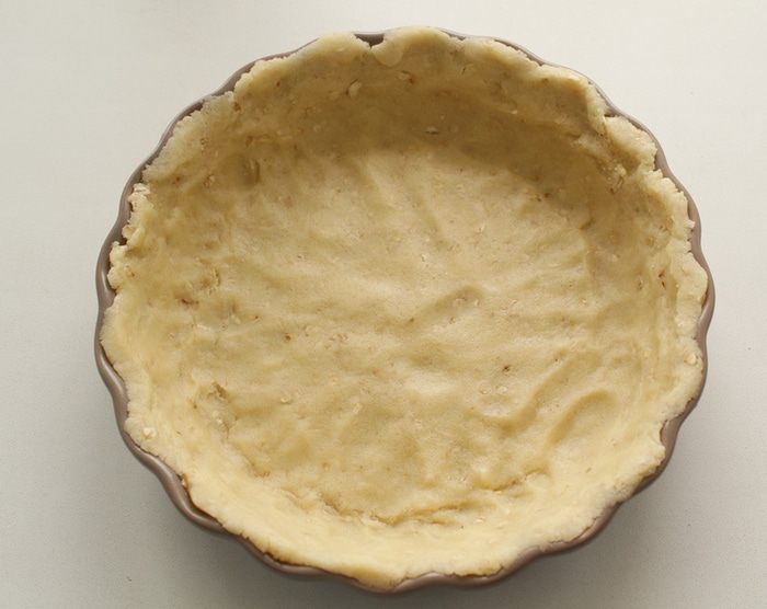 Отложить небольшой кусочек теста и отправить в холодильник. Остальное руками распределить по форме и тоже поставить в холодильник. Разогреть духовку на 190 градусов. Выпекать 15 минут, до лёгкого зарумянивания.