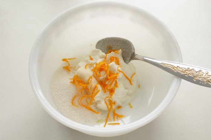 Рикотту хорошо перемешать с сахаром и апельсиновой цедрой.