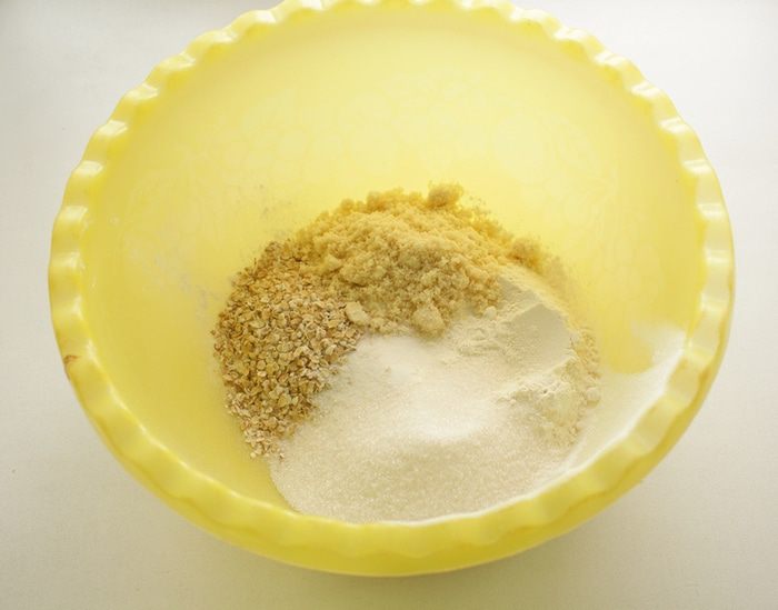Смешать муку, овсяные хлопья, миндаль, сахар и соль.