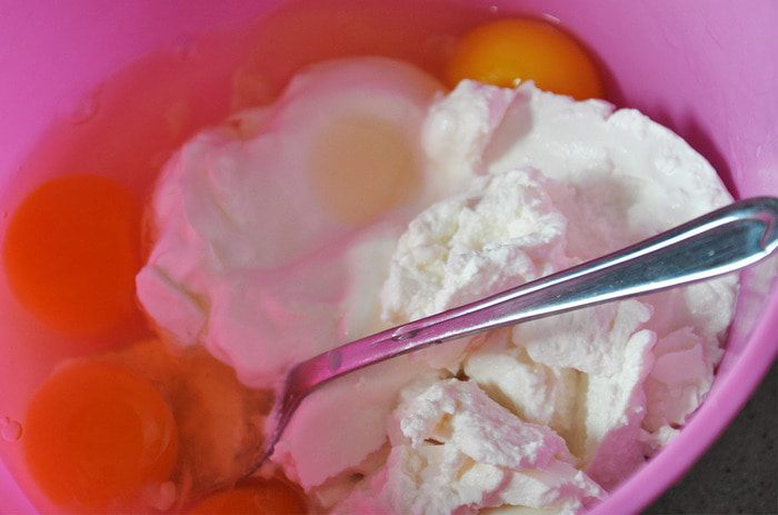Приготовить тесто. Для этого смешать ложкой сыр, сметану, яйца. Просеять муку, перемешать.