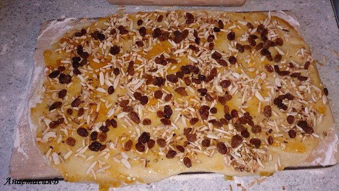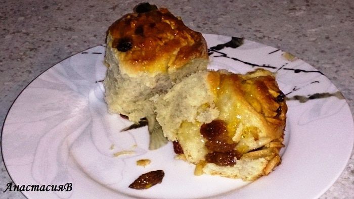 Растопить масло, влить оставшееся молоко. Добавить яйцо с молоком к тесту, месить около 5 минут и, накрыв, снова дать подойти 30 минут.