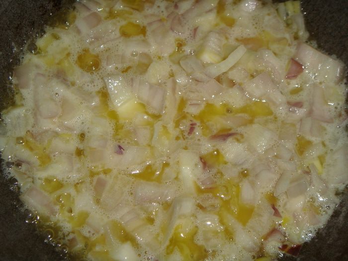 Нагреть сковороду, растопить в ней сливочное масло и выложить лук. Обжарить лук до золотистого цвета.
