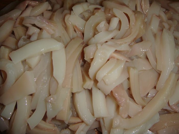 Кальмары помыть, обдать кипятком, снять кожицу и еще раз промыть. Нарезать тонкими полосками.