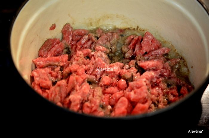 В жаровне на масле обжариваем говяжий фарш отдельно.