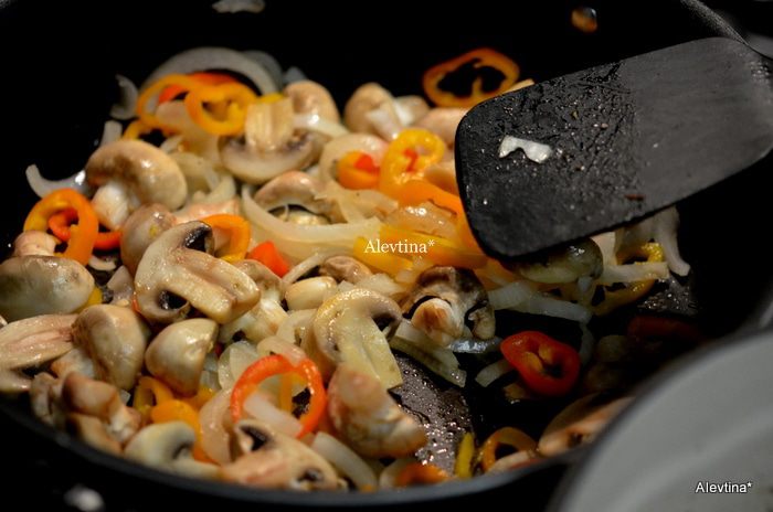 Добавим затем шампиньоны, обжариваем несколько минут, затем сладкий порезанный перец.