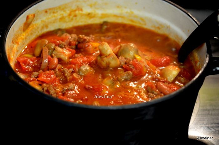Овощи обжаренные с грибами добавляем в фарш, затем фасоль баночную готовую, промытую с баночки, томатный соус, готовая сальса. Тушим все вместе и помешиваем до готовности.