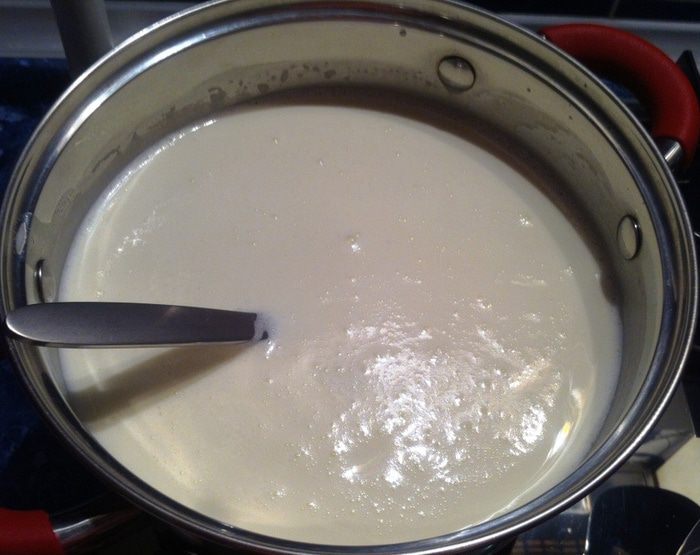 Когда сахар начнет кристаллизоваться, осторожно начинаем добавлять к нему сливки, не забывая постоянно размешивать.
