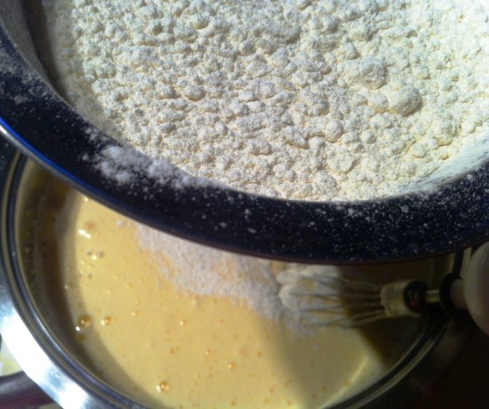 Мало-помалу смешать в эту смесь муку.