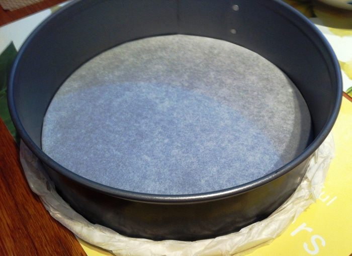 Накройте противень пекарской бумагой, положите кольцо (у меня 26 см), дно кольца, обернув бумагой для выпечки.