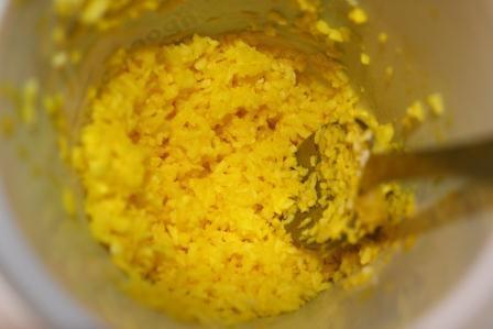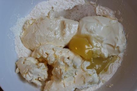 Займемся тестом. Маргарин необходимо размять, добавить сахар, яйцо, майонез, растительное масло, гашеную в уксусе соду, крахмал и ванилин. Все тщательно перемешать. Постепенно добавить муку, ее нужно столько, чтобы тесто отставало от рук. У меня ушло 2,5 стакана.