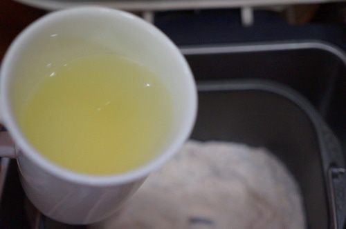 Отдельно в чашке соединяем лимонный сок, теплую воду и соль. Выливаем в хлебопечку.